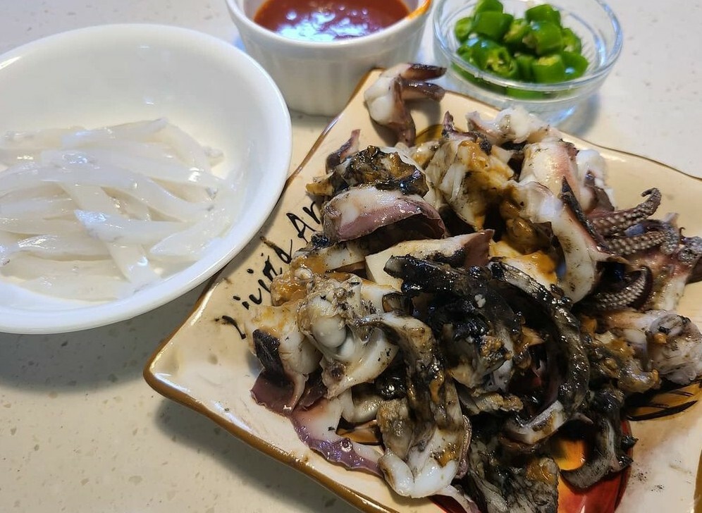 전 갑오징어 먹을 때 통으로 쪄서 먹물 터트린 후